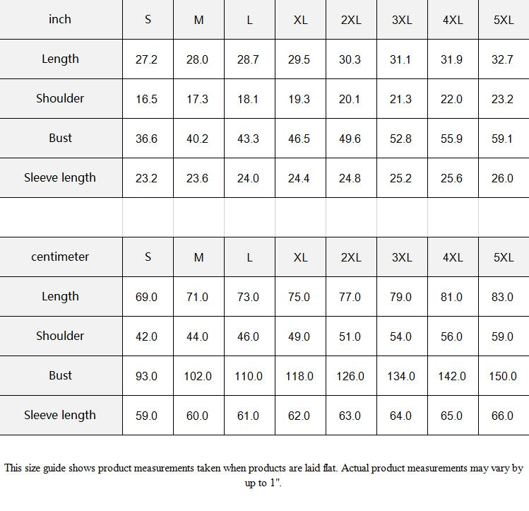 | inch | S | M | L | XL | 2XL | 3XL | 4XL | 5XL |
